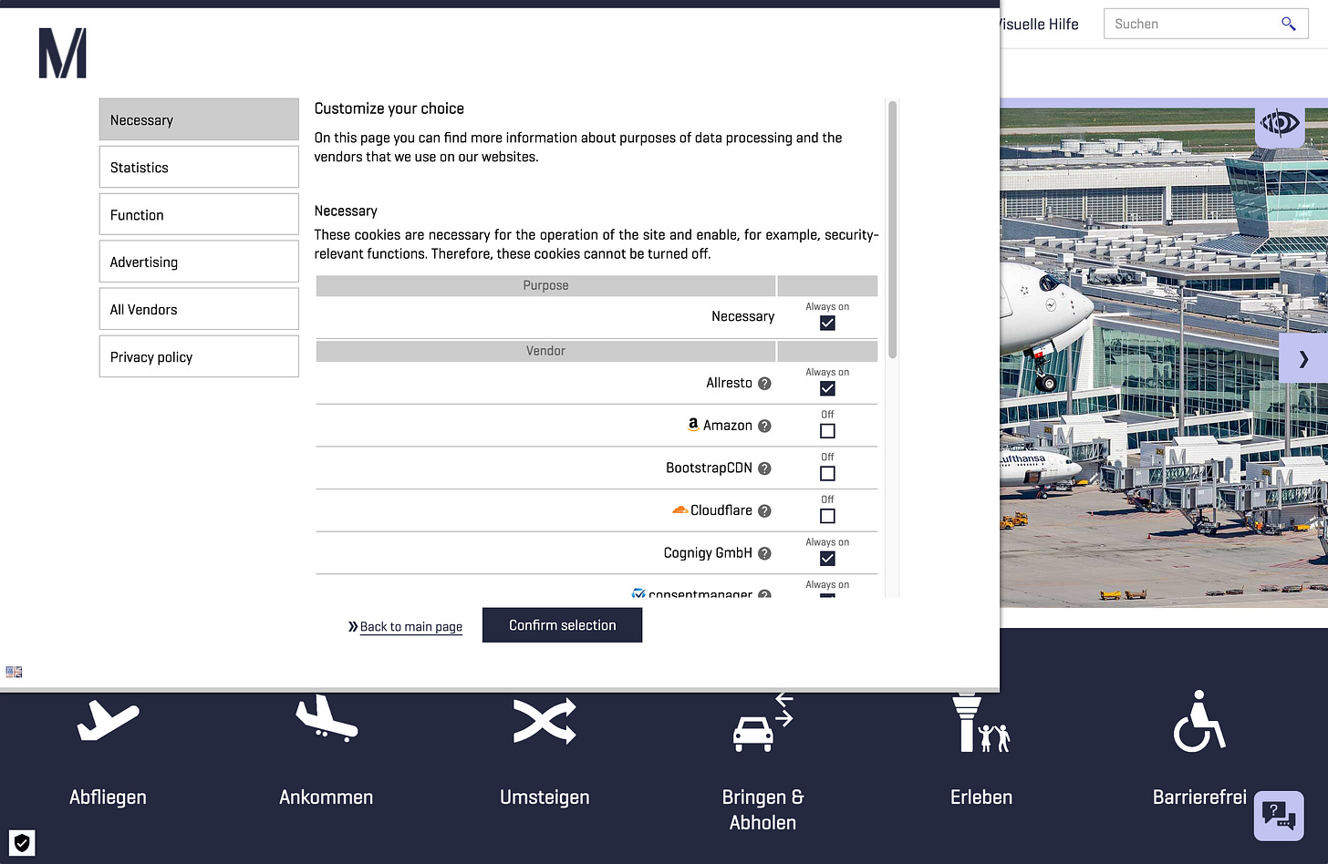 Munich Airport Cookie Consent - here you have the option to see a condensed version, but some sites force you to either “confirm all” or manually deselect from the entire list
